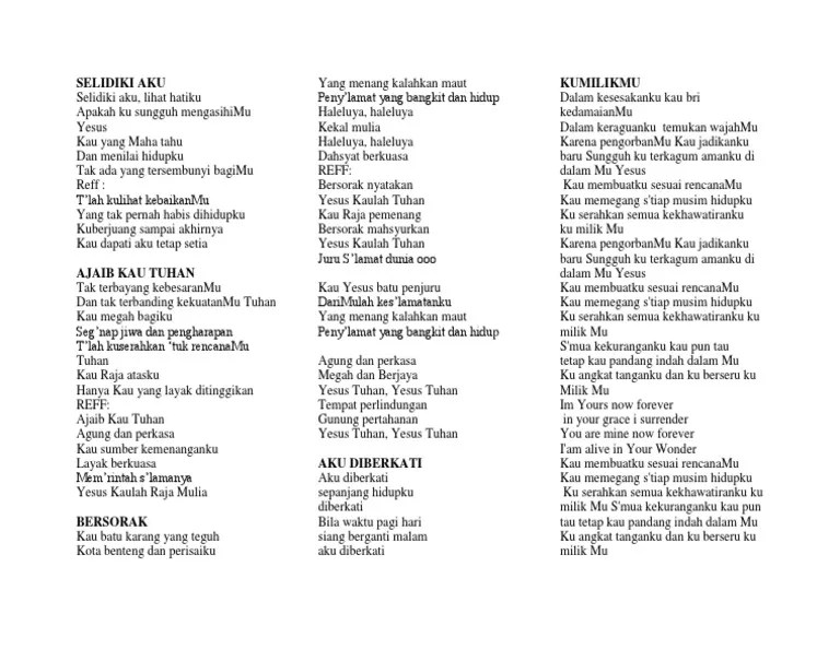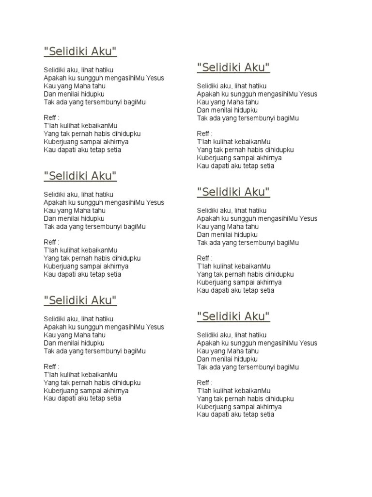 Verse 1 g ujilah aku tuhan c d g cobalah aku tuhan c d bm em selidiki batinku dan hatiku am d g c mataku tertuju padamu verse 2 g d g aku cinta padamu tuhan c d g aku rindu hadiratmu tuhan c d bm em aku ingin selalu dekat padamu am d g d menikmati kehadiranmu chorus g ku. Untuk update part 2 2. Am7 d g kau layak disembah. chords for selidiki aku by nikita. Am c f em g verse : Ku nyanyi hosana bagi rajaku yang duduk di tahta aku muliakan. Kan ku berjuang pada akhirnya. Apakah ku sungguh mengasihimu yesus. Apakah ku sungguh mengasihimu yesus kau yg maha tau dan menilai hidupku tak ada yg tersembunyi bagimu. 14 agustus 2016 05.29 unknown mengatakan. Ku nyanyi hosana bagi rajaku yang duduk di tahta aku muliakan dan kuagungkan kau layak disembah Foto bukti transfer lalu dikirim via wa/email 3. A e/g# f#m kalau harus ku mengingatmu lagi e d aku takkan sanggup c#m bm e dengan yang terjadi pada kita a e/g# f#m jika melupakanmu hal yang mudah e d ini takkan berat c#m bm e